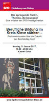 Im Rahmen unserer Veranstaltungsreihe "Der springende Punkt - Themen die bewegen!" laden wir alle interessierten Bürgerinnen und Bürger ein, mit uns und den Expertinnen und Experten auf dem Podium über die Zukunft der beruflichen Bildung im Kreis Kleve zu diskutieren. Die Veranstaltung zum Thema "Berufliche Bildung im Kreis Kleve stärken - Podiumsdiskussion über die Zukunft des Berufskolleg Goch" findet am Montag, 9. Januar 2017, von 18.00-20.30 Uhr im Gocher Kastell statt. Einladungsflyer: http://www.spd-kreistagsfraktion-kleve.de/dl/Flyer_Veranstaltung_Berufliche_Bildung_Web.pdf Über Ihre Teilnahme und Anmeldung unter buero@spd-kreistagsfraktion-kleve.de würden wir uns sehr freuen. |